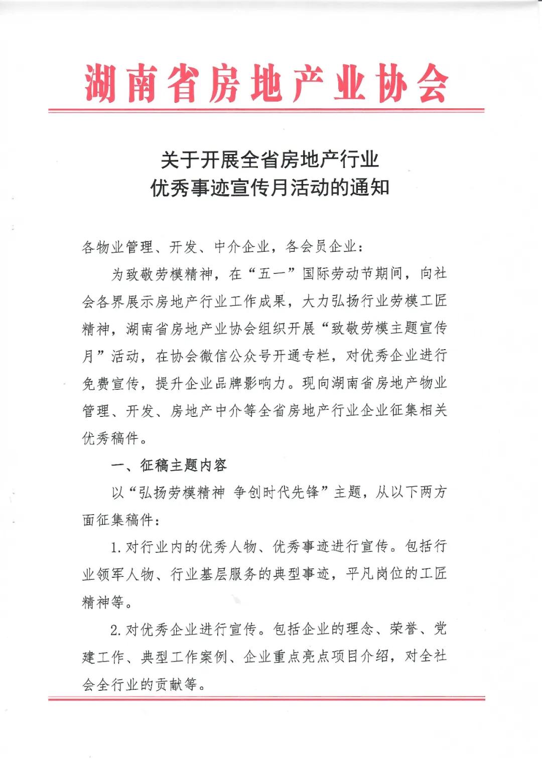 為致敬勞模精神,在“五一”國際勞動節期間,向社會各界展示房地產行業工作成果,大力弘揚行業勞模工匠精神,湖南省房地產業協會組織開展“致敬勞模主題宣傳月”活動,在協會微信公眾號開通專欄,對優秀企業進行免費宣傳,提升企業品牌影響力。現向湖南省房地產物業管理、開發、房地產中介等全省房地產行業企業征集相關優秀稿件。