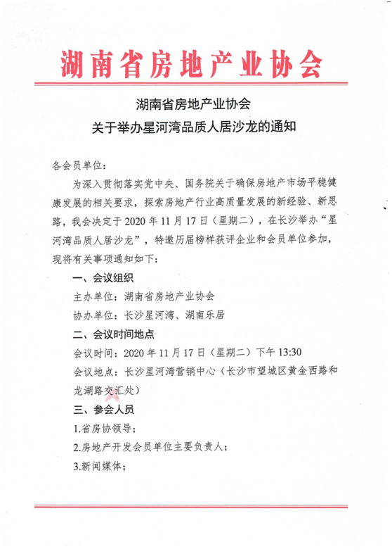 搭建創新交流平臺,共促行業高質量發展!由湖南省房地產業協會主辦,長沙星河灣、湖南樂居協辦的“星河灣品質人居沙龍”活動將于11月17日舉辦!本次活動主要邀約歷屆榜樣獲評企業主要負責人共同探討行業高質量發展背景下行業面臨的機遇與挑戰。活動將聚焦我省高端優質樓盤“星河灣”項目運營經驗分享,組織大家參觀項目,進行沙龍活動等。