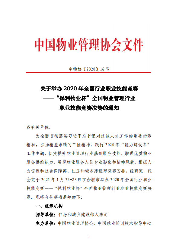 剛剛,中國(guó)物業(yè)管理協(xié)會(huì)發(fā)布了《關(guān)于舉辦2020年全國(guó)行業(yè)職業(yè)技能競(jìng)賽——“保利物業(yè)杯”全國(guó)物業(yè)管理行業(yè)職業(yè)技能競(jìng)賽決賽的通知》,兩年一屆的全國(guó)總決賽終于塵埃落定。