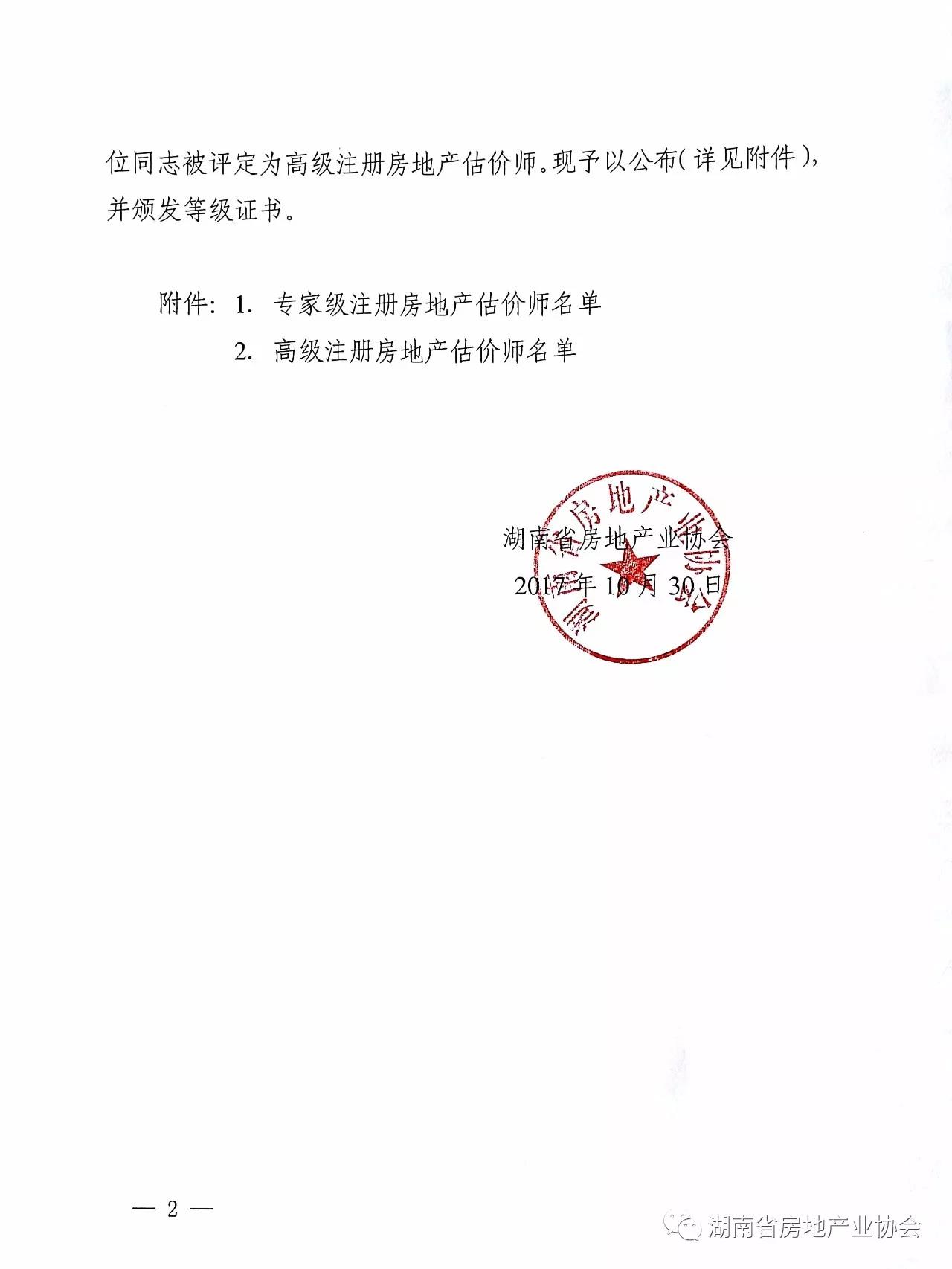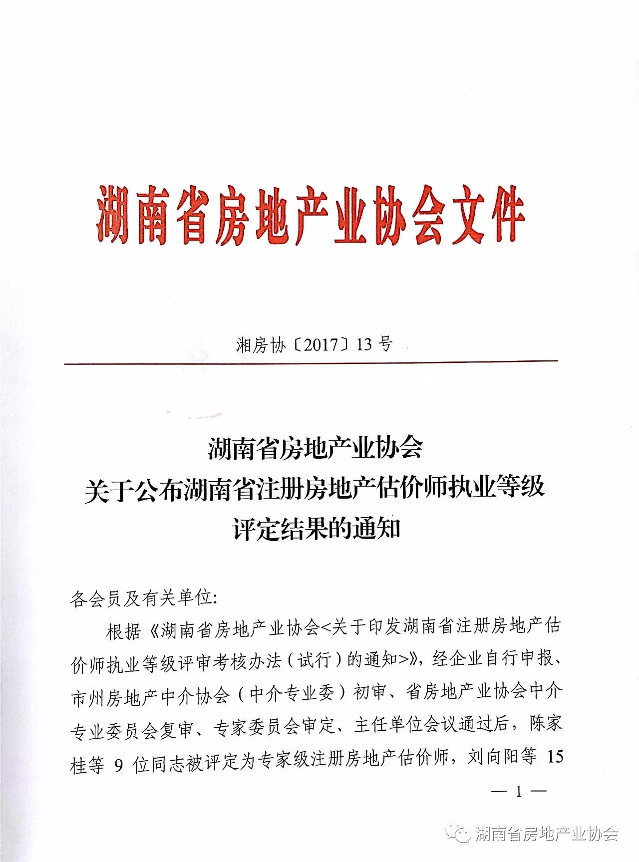 湖南省房地產業協會關于公布湖南省注冊房地產估價師執業等級評定結果的通知