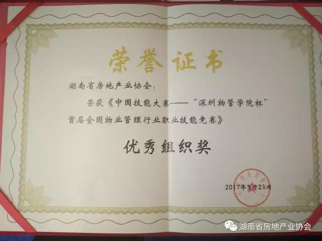 湖南省房地產業協會立足行業發展,積極發揮行業組織的引領作用,于4月8日認真組織舉辦了的本次全國賽事的選拔工作,得到了中國物業管理協會的高度肯定,被授予了全國物業管理行業職業技能競賽"優秀組織獎"。